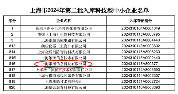9月5日,上海科學(xué)技術(shù)委員會(huì)發(fā)布的《上海市2024年第二批入庫(kù)科技型中小企業(yè)名單》,上海帝圖信息科技有限公司再次上榜!